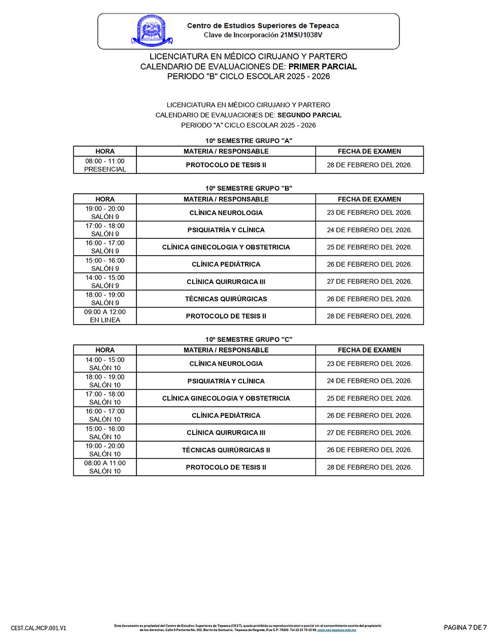 Ya están disponibles los calendarios primer parcial para los grupos del 4to al 9no semestre y segundo parcial para los semestres de 10mo, correspondientes al periodo "B" del ciclo escolar 2025